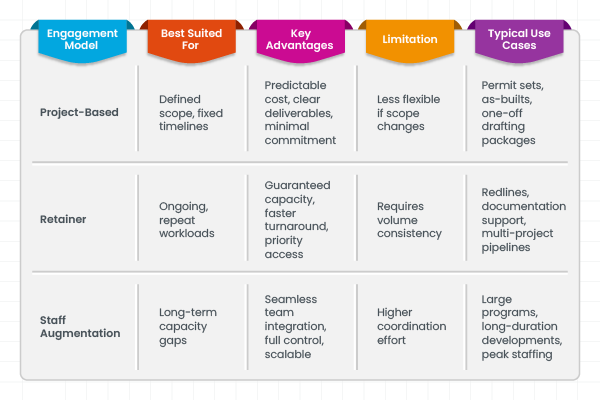 Large architecture firms rarely rely on a single engagement model- and for good reason. Mixing project-based, retainer, and staff augmentation models across portfolios allows teams to stay flexible as workloads shift.
